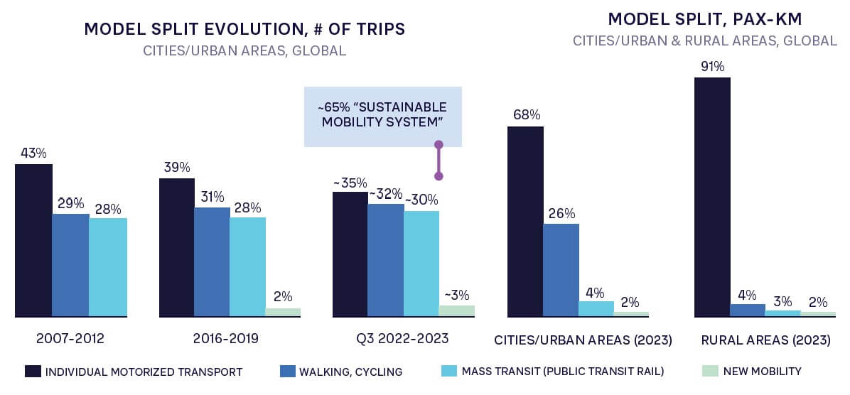 - Modal shift: This is about promoting a shift to less energy- intensive mobility modes, away from private cars toward mass public transport, active mobility, and new mobility modes such as micro, shared, and on-demand mobility. As is clear from individual car usage trends, making progress has been difficult and is partly driven by a lack of political will.