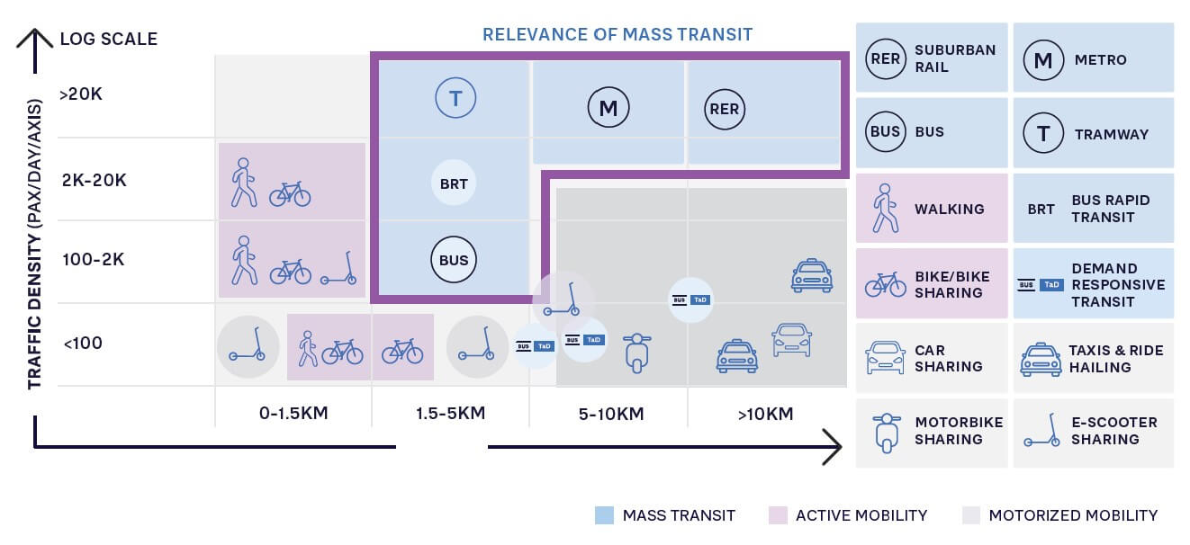 Authorities should become smarter with transport mode allocation by developing multimodal masterplans and prioritizing transport services according to their performance and affordability. That means further development of mass transit as the “backbone” of the virtuous mobility system whenever traffic density justifies the investments. It also means encouraging the use of active and micromobility services for under 5 km trips and shared and on-demand motorized mobility, such as car sharing, taxi, and ride hailing, for longer-distance travel and in lower-density areas where investment in mass transit is not justified (see Figure 4).